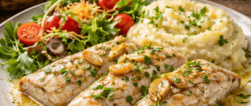 Receta tradicional con ensalada fresca, puré cremoso y pan casero